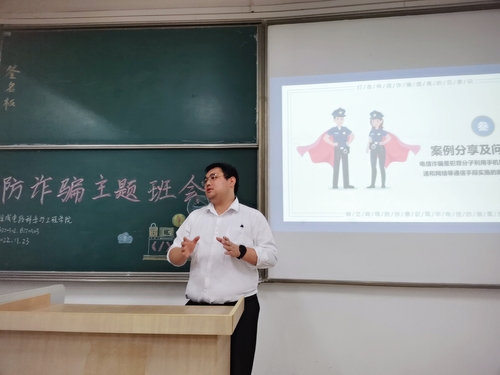 辅导员王辉老师结合学院防范电信诈骗的工作指出,全体同学一定要保持警惕之心,同学之间做到多提醒、多关心,以实际行动筑牢安全防线,维护校园和谐稳定。