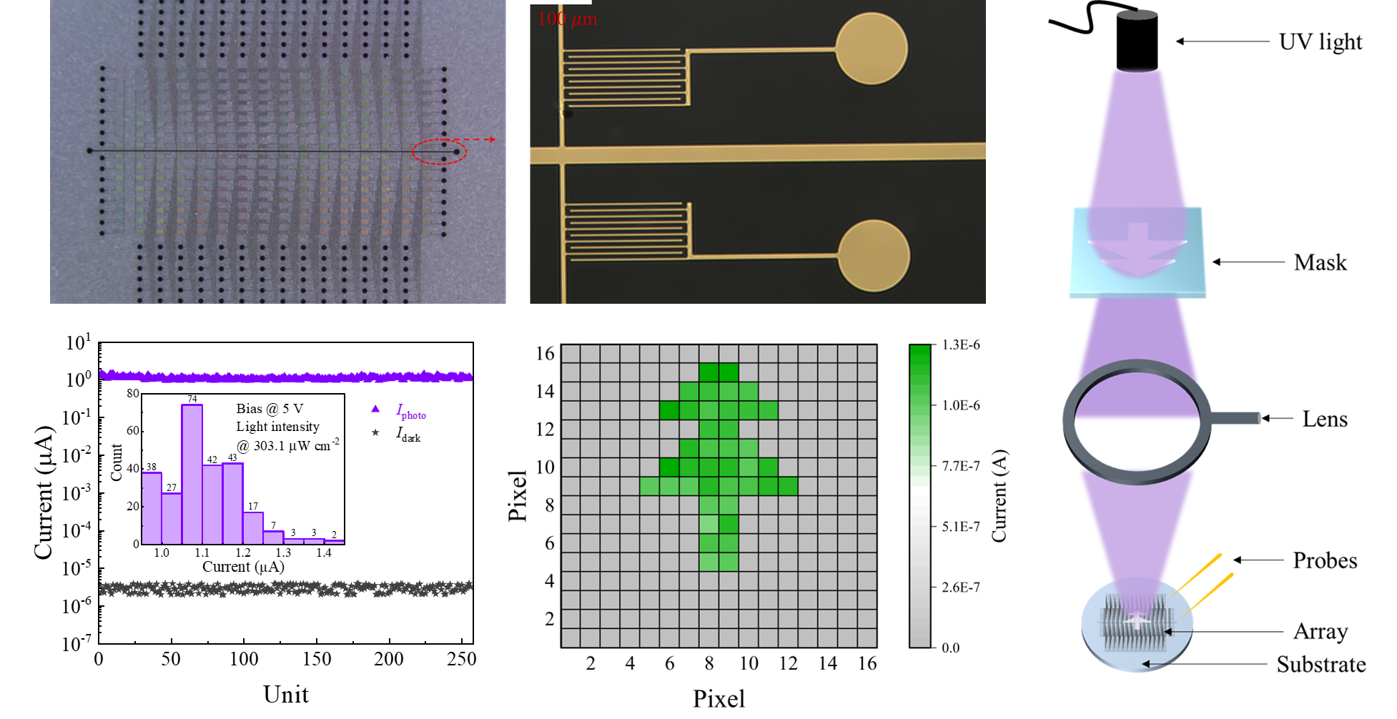 近日,得益于在Ga2O3基光电导型、肖特基型以及异质结构的光电探测器件方面的多年积累,麻豆做爱 唐为华教授领导的氧化镓创新中心(IC-GAO)成功制备出基于MOCVD生长2英寸β-Ga2O3薄膜的88和1616日盲紫外探测器阵列。相较于线性布局,该工作中的1616方形布局更有利于节省探测器阵列的占用面积,利于集成化应用,且无需复杂的绝缘隔离工艺。可一次性、快速地对较复杂的图像进行记录并通过外部电路读出。该阵列8103的紫外/可见光抑制比显示出良好的波长选择性,为精确日盲紫外成像奠定基础。响应度达到了60.7 A W-1、探测度达到了2.21014 Jones、线性动态区为120.34 dB以及快速的响应时间。值得注意的是,对256个单元进行电学测试,发现暗电流均在2 pA和4 pA间,最大标准偏差在6%-10%。这些表明了器件良好的均匀性和在紫外图像传感应用领域的潜力。相关成果发表在IEEE Electron Device Letters (doi: 10.1109/LED.2023.3272909)和Science China Technological Sciences (doi: 10.1007/s11431-022-2404-8)上。论文第一作者为研究生沈高辉,通讯作者为唐为华教授和刘增副教授。工作是与郭宇锋教授团队密切合作完成,研究得到国家重点研发计划、国家自然科学基金等项目的资助。