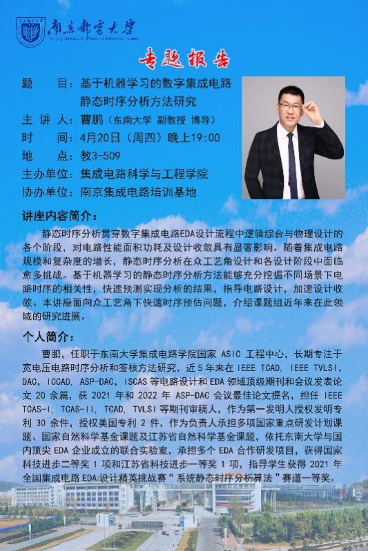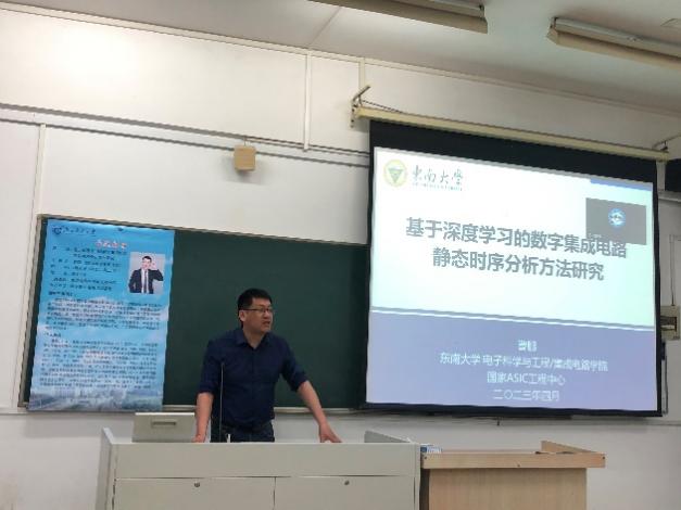 做“基于机器学习的数字集成电路静态时序分析方法研究”专题报告,报告由集成电路科学与工程学院郭静静老师主持。集成电路学院本科生、研究生等五十余人聆听了报告。