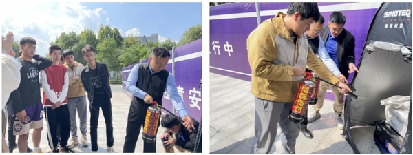 消防应急疏散演练后,保卫处副处长吴学政、消防科科长张苏赣为学院师生们讲解了灭火器工作原理及其具体使用方法,并在现场使用模拟设备演示灭火规范操作。
