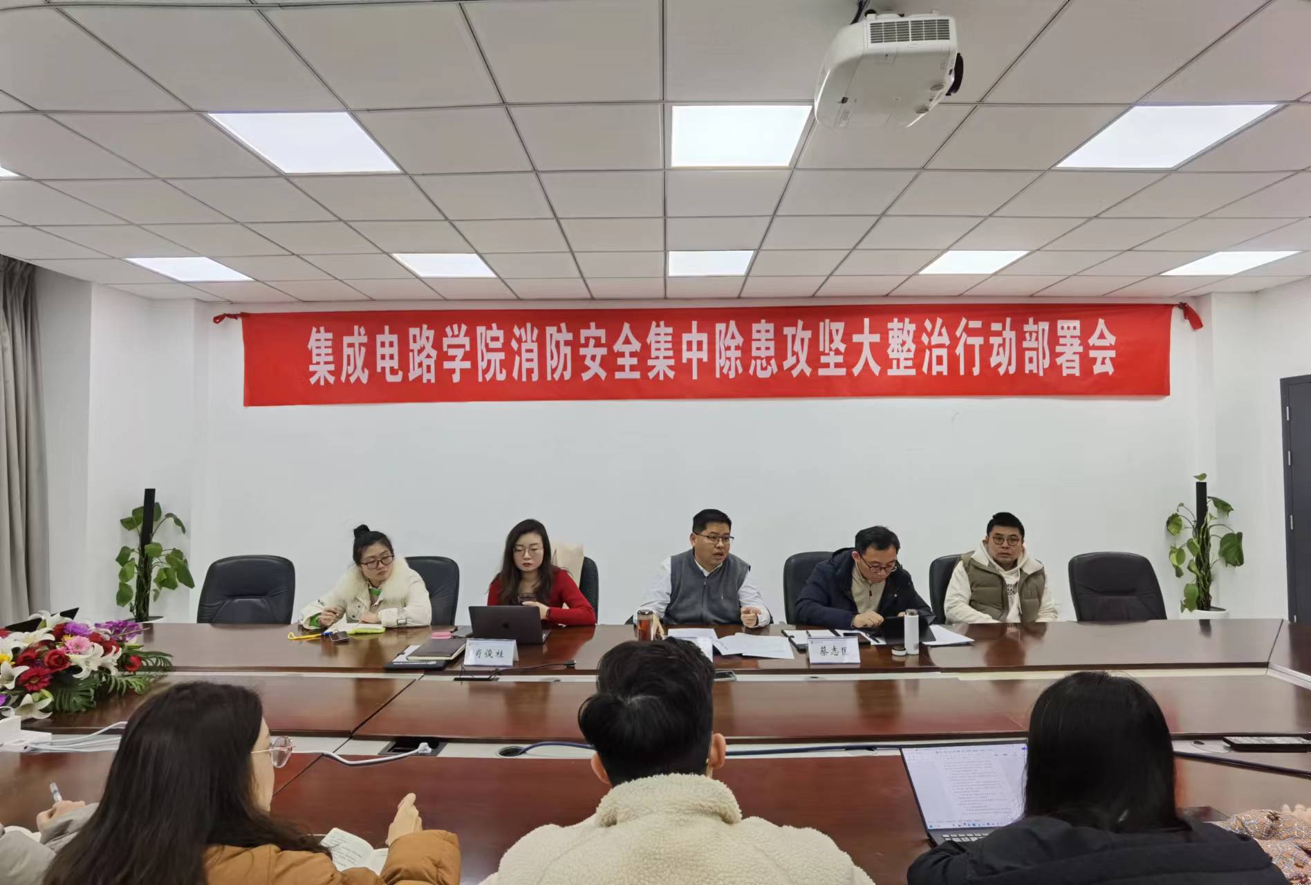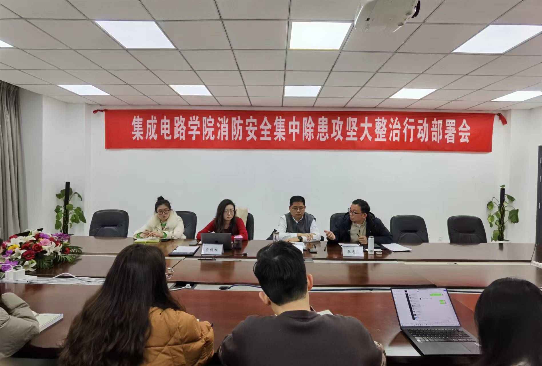 蔡志匡院长对具体工作进行了部署:1.全院师生要加强学习此次消防安全集中除患攻坚大整治行动文件,要善于发现问题,解决问题,明确分工,责任到人,落实到位;2.要严格按照学校文件通知的时间节点,全面排查消防安全风险隐患,尤其针对学院实验室、学生宿舍等重点场所,排查彻底,不留死角,要登记上账、闭环管理,分类施策、逐一销账;3.要加强消防安全培训和应急疏散演练,物业要强化值班值守;4.浦口办学点要同步推进,保持与浦口高新区科创集团联动,确保工作效果。