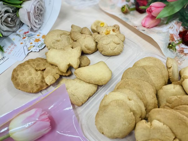 活动现场,烘焙小屋给大家准备好制作原料。大家细心地裱花,将奶油装进裱花袋,轻轻按动裱花袋的尾端,把稳花嘴对准蛋糕的中心,一按一挤,一个个精致可口的纸杯蛋糕便呈现在眼前。饼干制作的趣味在于创作,没有模具的束缚,大家摘起一段面团,在掌心揉搓呈球状,轻轻按压,充分发挥女性的美食天赋和想象力,便有了小熊、笑脸、兔子等可爱的卡通状饼干。当饼干烤出来后,老师们、同学们品尝着自己的劳动成果,体会着节日的喜悦。