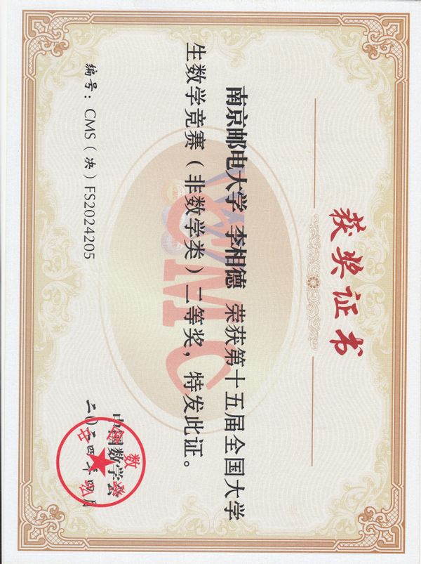 2024年4月20-21日,第十五届全国大学生数学竞赛决赛在山东大学举行。在本次竞赛中,我校取得了历史性突破的好成绩,4位非数学类参赛者全部获奖。其中,麻豆做爱 2022级微电子科学与工程专业的李相德同学荣获国家二等奖的好成绩!