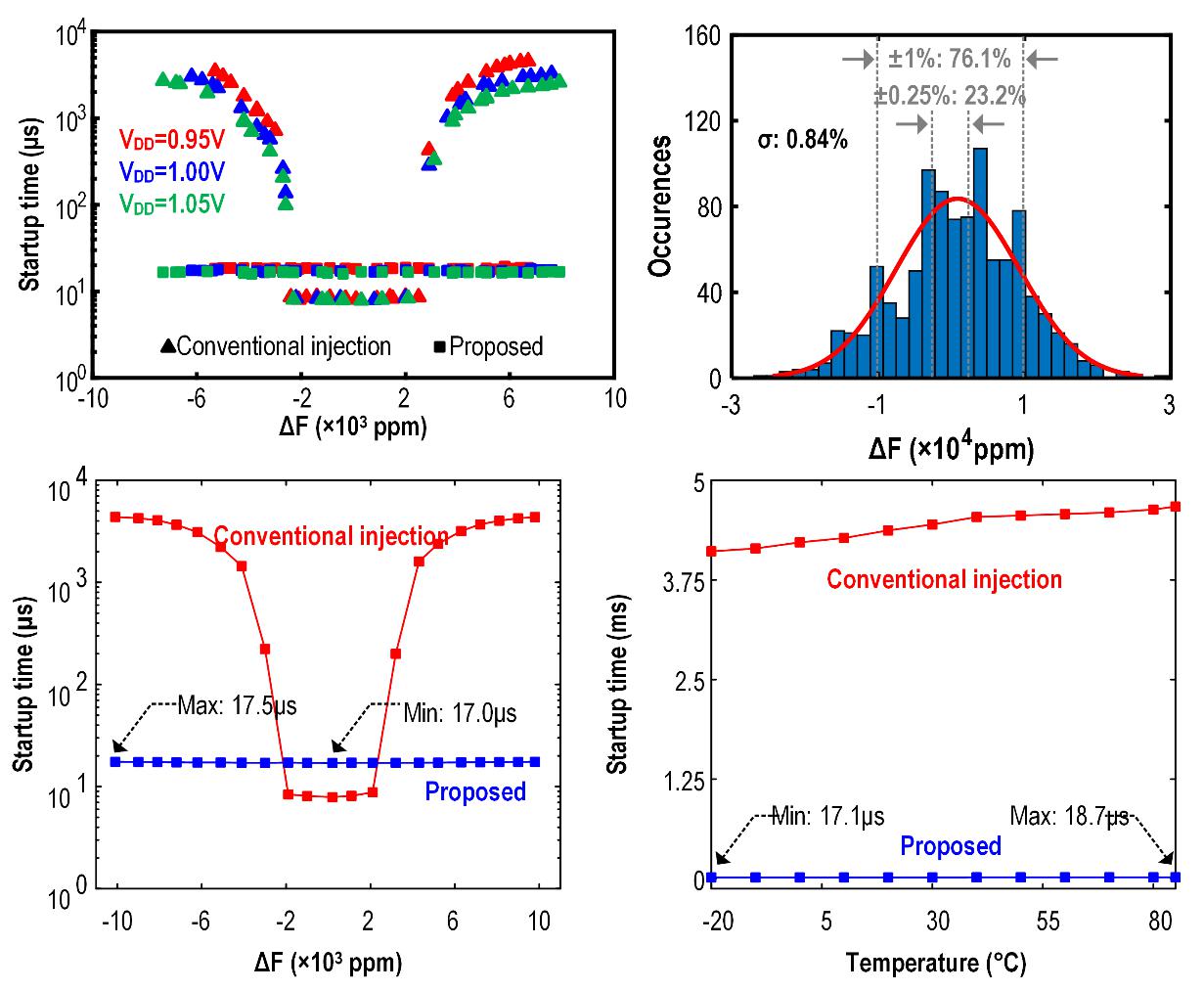 针对以上问题,团队提出一种基于相位误差自动校准的单边注入技术,引入负反馈对注入信号相位实时校准,从根本上克服了注入频偏对启动速度的影响。研究团队基于40纳米CMOS工艺完成了芯片的原型开发,实验结果表明,在注入频偏为±1%的范围内,时钟启动时间均小于19μs,突破了注入频偏的常规容限(5000ppm)。多样片(30pcs)测试结果显示,在0.95~1.05V电压范围内,采用单边注入技术的有效样片数量比传统注入技术高69%。由此可见,团队提出的单边注入技术显著提升了电路鲁棒性和芯片良率,对推动注入技术的落地应用和快启动时钟芯片的商用进程具有重要意义。
