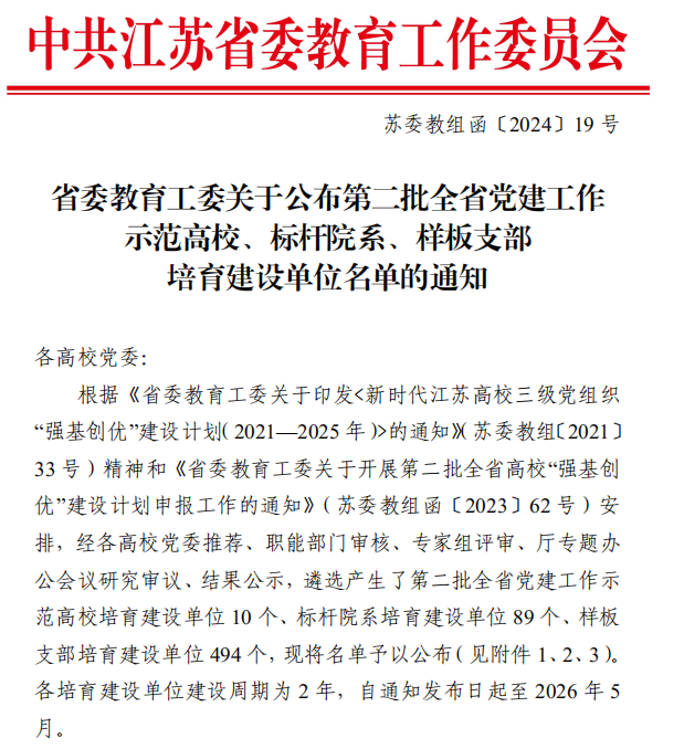 根据《省委教育工委关于公布第二批全省党建工作示范高校、标杆院系、样板支部培育建设单位名单的通知》苏委教组函〔2024〕19号,麻豆做爱 微电子系教工党支部成功入选第二批全省党建工作样板支部培育建设单位。