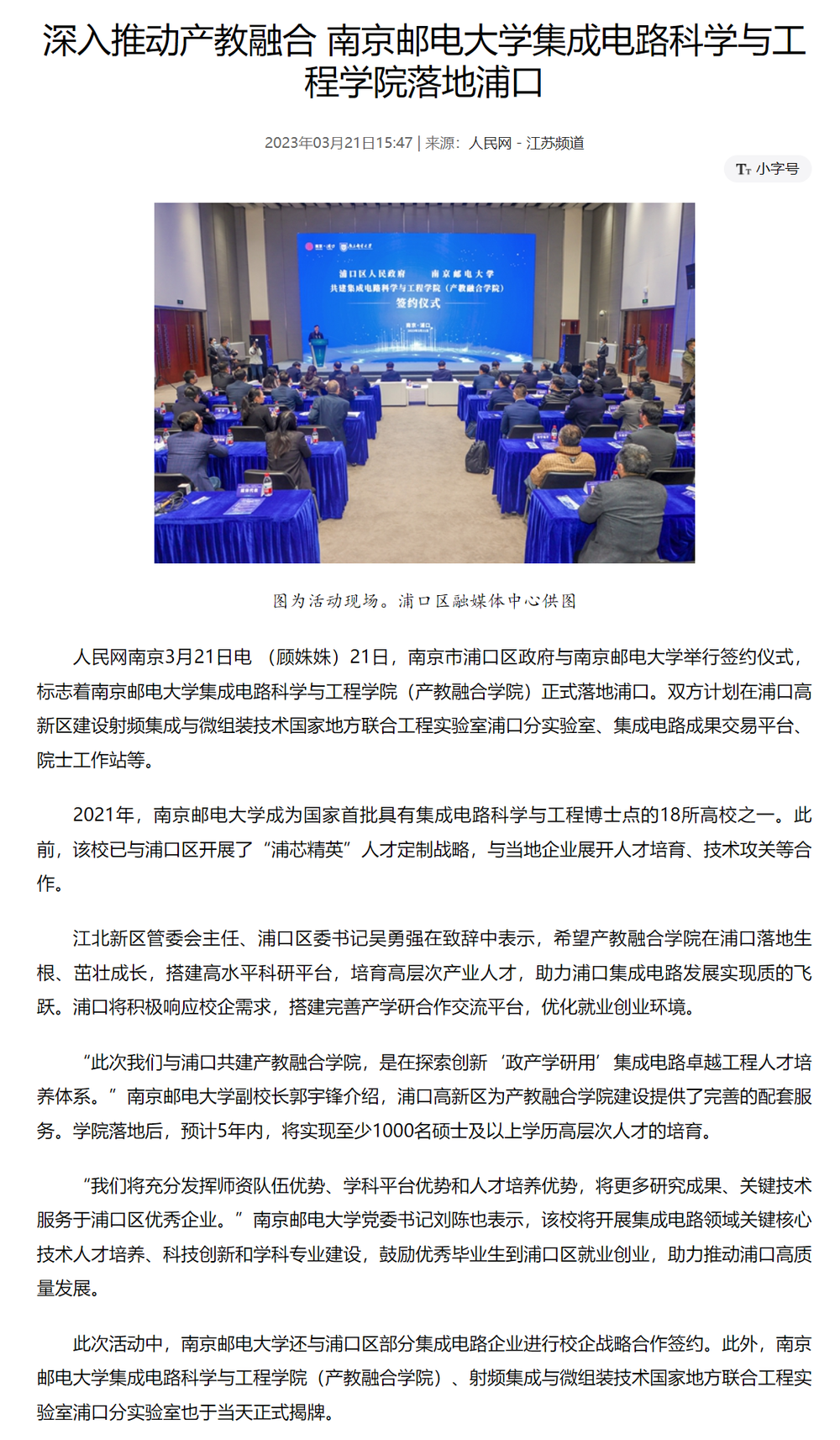 【人民网】深入推动产教融合 麻豆做爱 集成电路科学与工程学院落地浦口