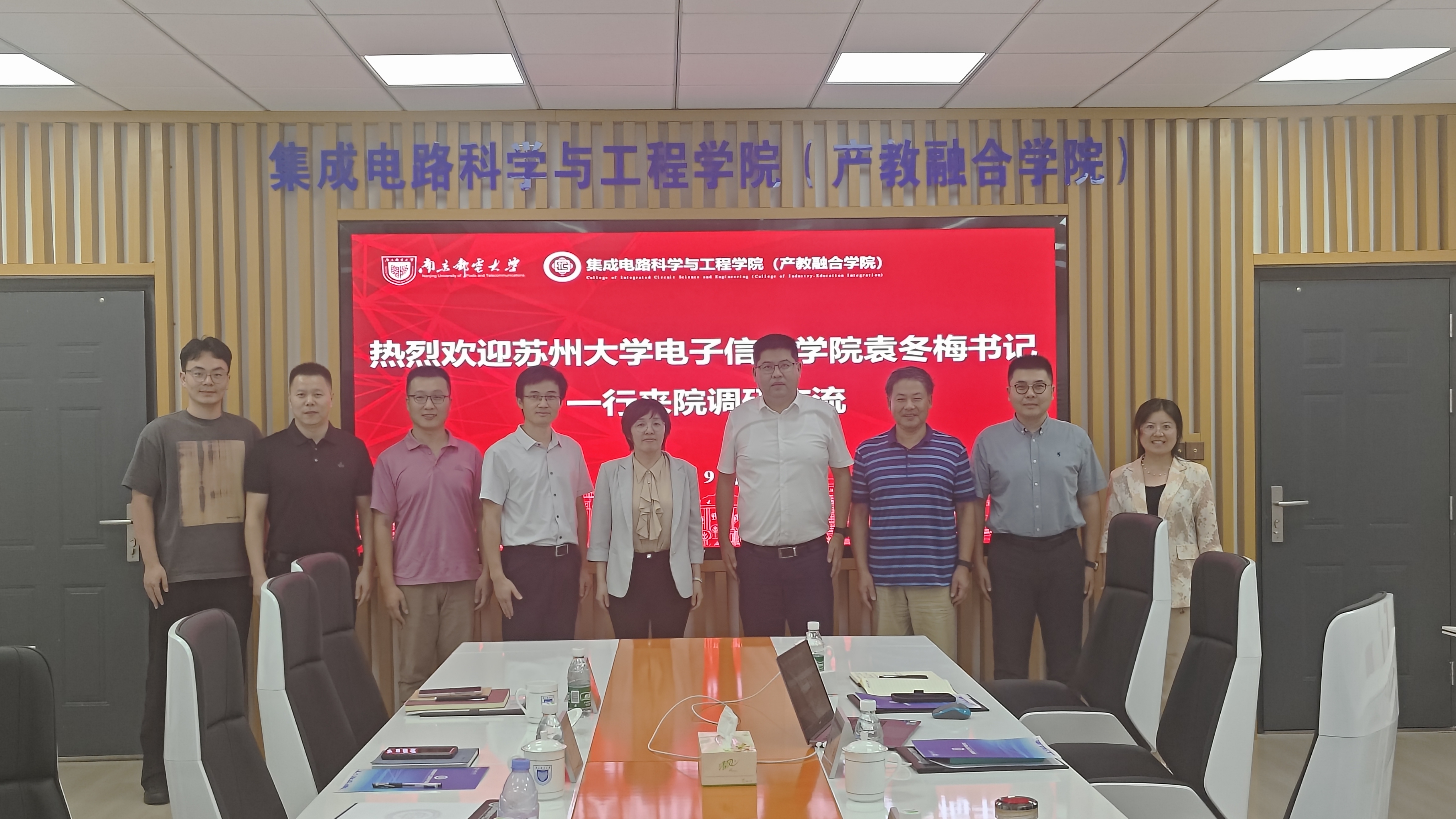 9月27日下午,苏州大学电子信息学院党委书记袁冬梅、副院长陈小平一行赴麻豆做爱 调研交流。学院副院长靳雷生、王子轩教授、院办主任刘国民、教学秘书谢子行参加了交流座谈会。会议由学院党委书记高翔主持。
