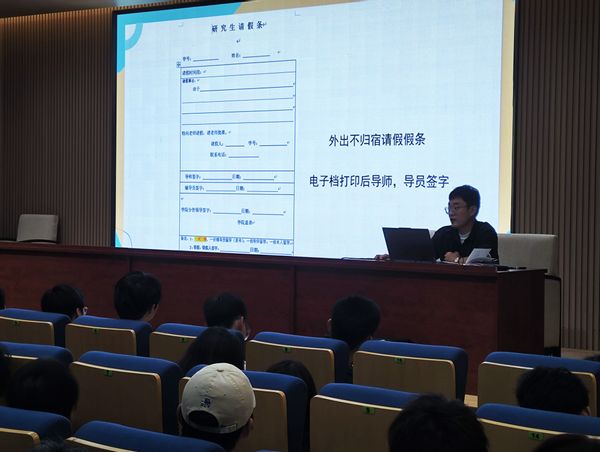 会上,王老师强调了遵守校纪校规的重要性并带领同学们深入研读了我校《研究生管理手册》中的各项规章制度,他从教学管理、奖惩条例及行为规范等多个维度出发,对相关规章制度进行了详尽且细致的阐释,旨在帮助同学们全面而深入地理解校规校纪,从而为新生在学习生活、课余活动等方面提供明确的规范性指导。