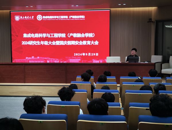 为加强研究生新生的安全意识,明确青年学生的时代责任,集成电路与工程学院(产教融合学院)于9月29日在浦口办学点报告厅举办了“放假不放松,安全记心中”主题的十一假期安全教育大会暨2024级研究生年级大会。辅导员王永鹏老师、优秀研究生代表王怡钦学长及全体新生参加了本次大会。