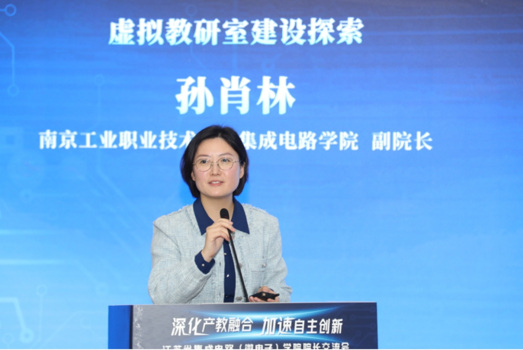 南京工业职业技术大学集成电路学院副院长孙肖林就共建虚拟教研室打造阐述思路,她表示,基于集成电路学科交叉、专业领域发展、产教深度融合、国家对教师数字素养提升等需求,以及‘智能+’时代背景,虚拟教研室建设尤为重要。学院结合国家虚拟教研室建设标准,将人工智能与教育教学深度融合,探索构建跨专业、学科知识图谱,并结合智能化与个性化支持来实现智能助教功能、数据分析与反馈和教学模式改革。