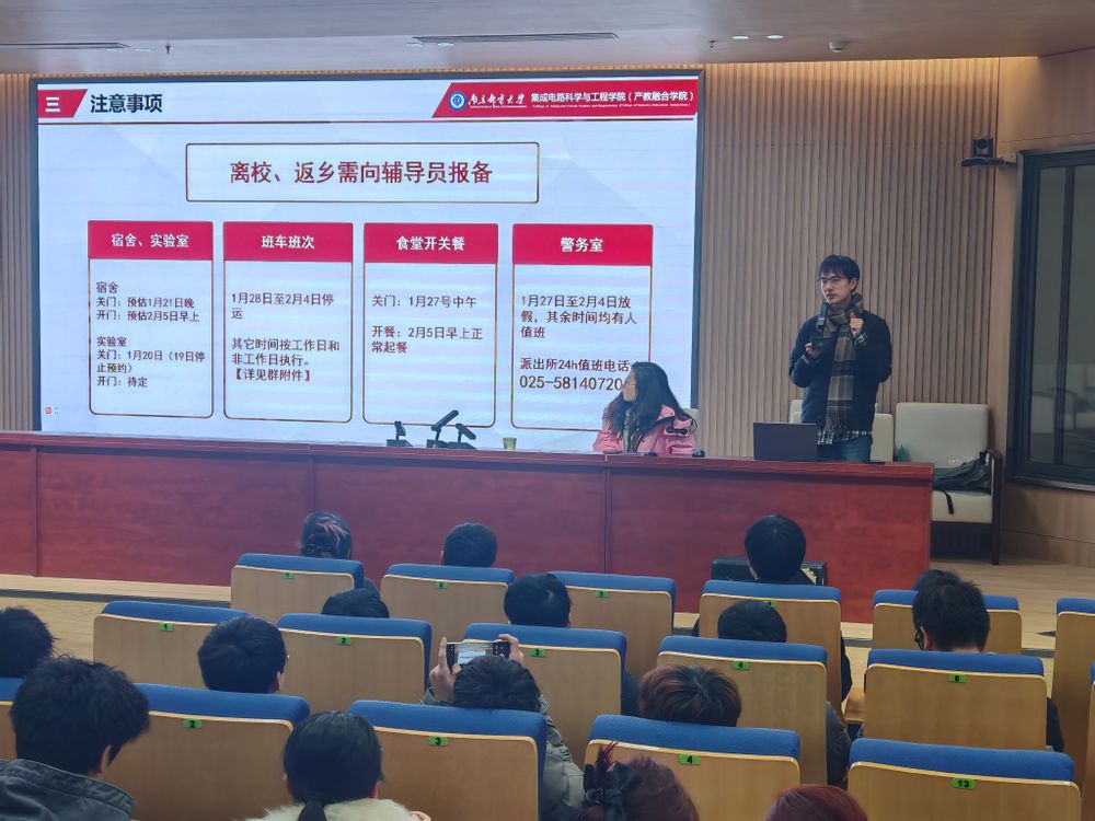 114日下午14:00,研究生辅导员张龙组织全体寒假申请留校研究生在浦口1号楼报告厅召开研究生假期管理与安全教育大会。院党委副书记、副院长肖俊桂出席,学院全体留校研究生参会。会上,张龙老师就寒假留校期间学生管理规范进行了解读,并为学生介绍了浦口行政、食堂、生活区等开放、关闭时间,以便同学们能够合理安排假期校内生活。肖书记在会上叮嘱同学们务必遵守假期留校的相关规定,出现任何问题应第一时间联系导师和辅导员,并结合实际案例,针对宿舍用电安全、食品安全、网络安全以及个人财物安全等提出了具体要求。