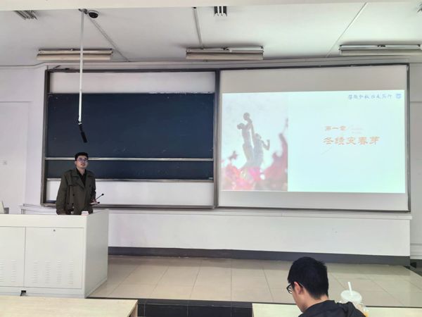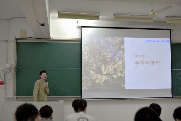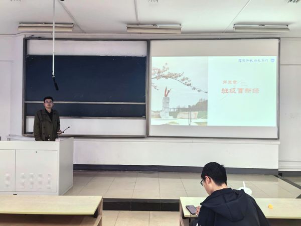 会议伊始,辅导员范建鹏以“冬绩变春芽”章节开篇,总结了上学期学业成绩,介绍了各专业的平均绩点和四级通过率等相关数据。随后他按班级分析了各班级的绩点、挂科率等关乎同学们学业方面的数据,对在大一上取得良好成绩的班级和同学给予了表扬,对成绩不太理想的班级和同学给予鼓励。