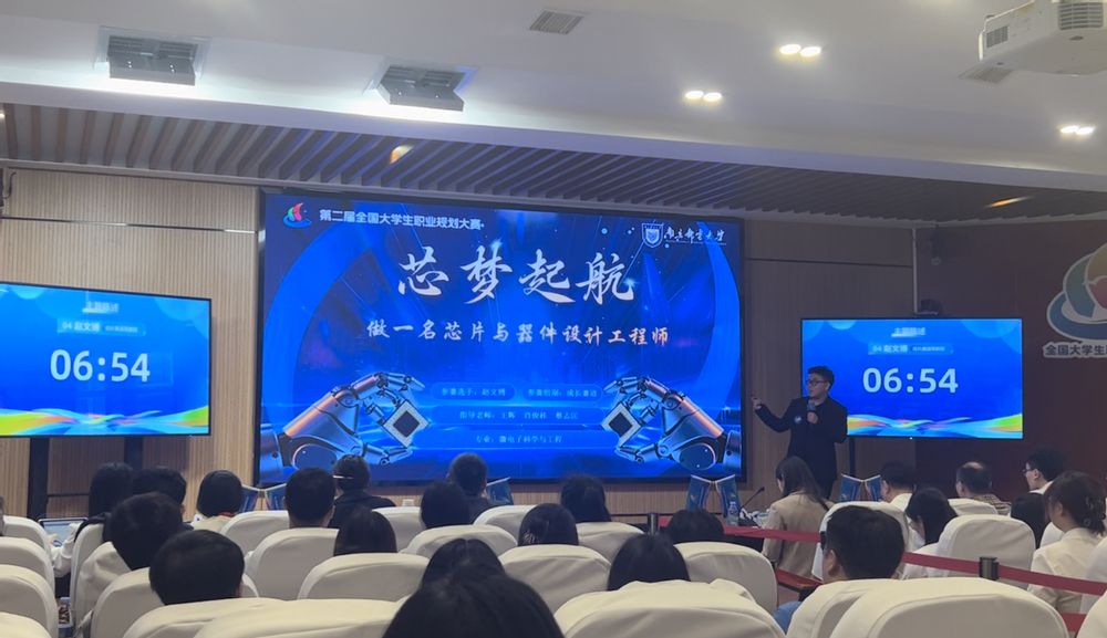 赵文博同学以《芯梦起航 成为一名芯片与器件设计工程师》为职业生涯主题,设计“科研攻关—产教融合—行业引领”职业路径。他在决赛中的答辩词引发广泛共鸣:“西方封锁什么,我们就要学习什么”——这就是南邮学子对“卡脖子”的有力回应,也是南邮将家国情怀贯穿人才培养的生动注脚。
