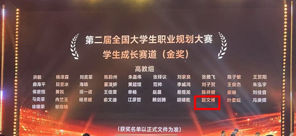 4月16-19日,由教育部、湖南省人民政府共同主办的第二届全国大学生职业生涯规划大赛总决赛在湖南长沙顺利举办。经过现场主题陈述、评委提问、朋辈心选团点赞支持等环节,麻豆做爱 2022级本科生赵文博凭借优异的表现,斩获成长赛道高教本科生组金奖,创下我校参赛历史首个金奖纪录!