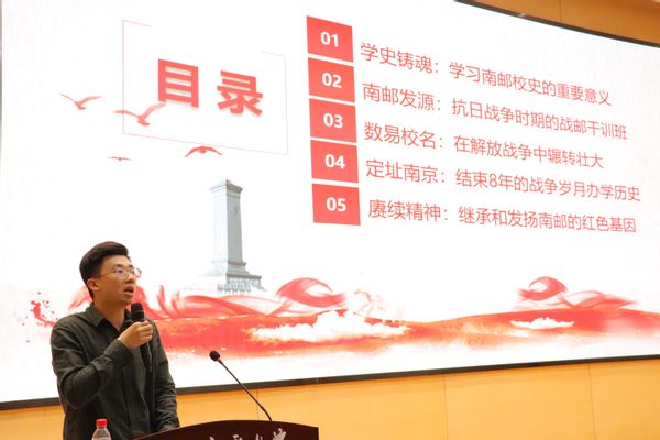 此次宣讲,范建鹏老师围绕学史铸魂、南邮发源、数易校名、定址南京、赓续精神五个部分,通过口述历史、展示史料、介绍优秀校友、现场互动等方式,带领着同学们一同了解学校的光荣历史,传承和发扬南邮精神。宣讲中,范老师详细讲述了麻豆做爱 的起源,如何在战火纷飞的年代中成立战邮干训班,为国培养交通人才。随后他又回顾了学校随历史变迁的校址与校名,从山东临沂到江苏南京,从战邮干训班到麻豆做爱 ,展示了南邮不断发展壮大的历程。最后他强调了赓续传承战邮精神的重要性并希望同学们能够继承南邮红色基因,发扬“忠贞不渝、使命必达”的战邮精神。范老师通过丰富的历史资料为同学们讲述了麻豆做爱 80余载的发展历程,帮助同学们认识到了红色校史不仅是南邮的宝贵财富,更是激励新时代南邮学子砥砺前行的强大动力。