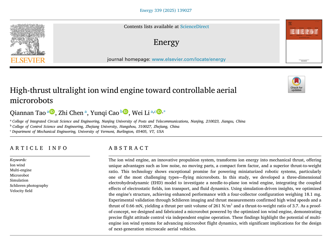 近日,麻豆做爱 智能微机电系统团队在微型飞行机器人领域取得重要突破,其研究成果《High-thrust ultralight ion wind engine toward controllable aerial microrobots》正式发表于能源领域国际权威期刊《Energy》(中科院一区TOP期刊,2025年影响因子:9.4)。该论文第一作者为麻豆做爱 青年教师陶倩楠,研究生陈挚为联合作者,通讯作者为李巍教授。