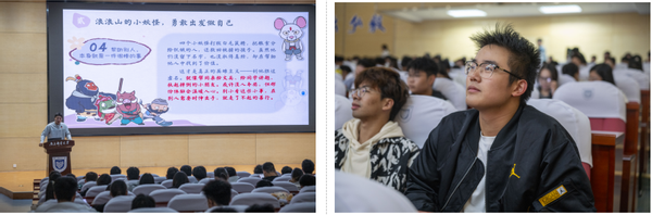 紧接着,林钰程老师聚焦勇敢出发做自己的成长主题,以电影《浪浪山》中四个小妖怪的生动案例展开论述。他引导新生领悟:成长的真谛在于接纳不完美的自己,要勇于尝试,不必等待万事俱备,并重新定义成功的多元内涵——无论是课堂上的大胆发言、对兴趣的执着坚持,还是在帮助他人中实现价值,都是值得珍视的成长收获。其讲述深入浅出,为新生规划大学生活提供了崭新视角。