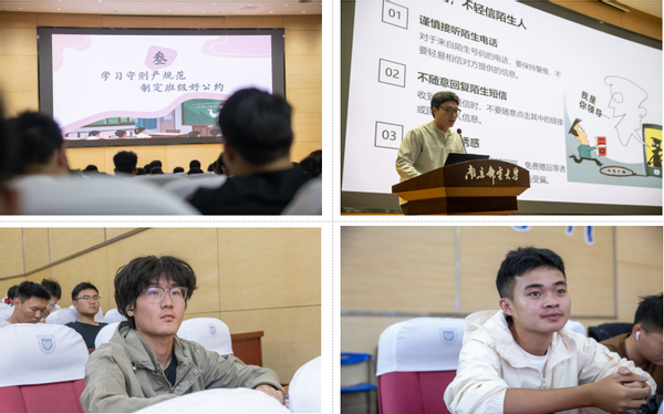 在随后的议程中,林老师通过学习守则严规范,制定班级好公约的主题阐述,系统构建了新生的规则意识框架。他从底线思维、校园红线、冲动代价三个维度,深刻阐释了大学生作为完全法律责任人应当具备的行为准则,并结合真实案例对学术规范与日常管理要求进行了具象化说明。随后开展的安全教育聚焦防电信诈骗、交通安全、消防安全、饮食安全等关键领域,通过情景化讲解使安全意识深入人心。整场讲座内容翔实、案例生动,有效强化了新生的校园规则意识与安全防范能力,为构建平安校园、和谐班级奠定了坚实基础。