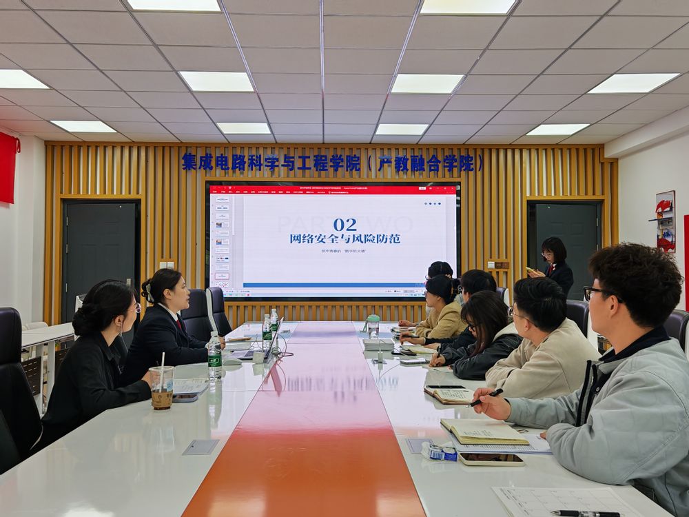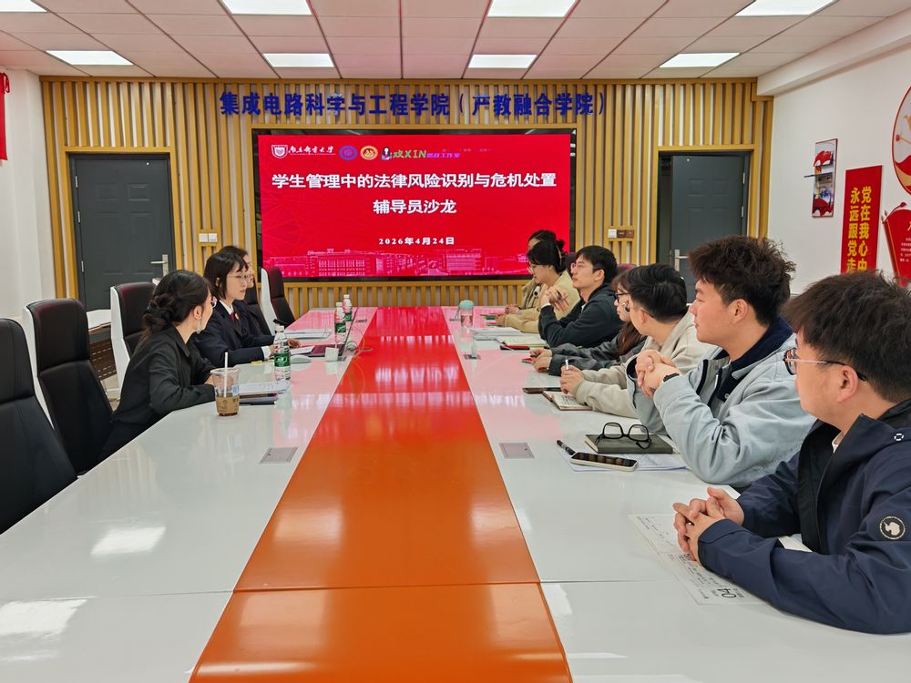 为进一步提升辅导员队伍法治素养,增强学生管理工作中法律风险识别与应对能力,近日,集成电路学院欢XIN思政工作室成功举办“学生管理中的法律风险识别与危机处置”主题辅导员沙龙。本次活动特别邀请南京市鼓楼区人民检察院检察官、法治辅导员赵玥、汪雪来院开展专题培训。学院党委副书记、副院长肖俊桂出席活动,全体辅导员参加学习。